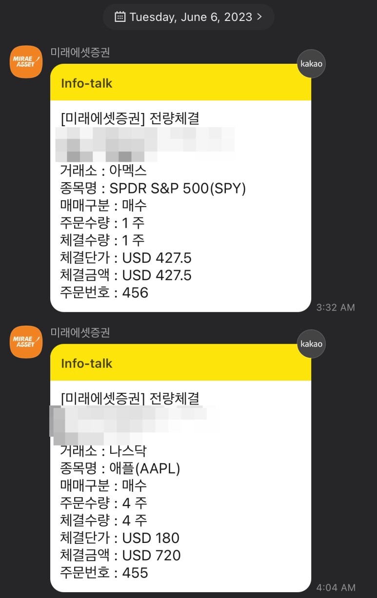 어제저녁 SPY (SPDR S&P 500), 스타벅스, 코카콜라를 예약매수 할때, SPY를 주당 $427.5로 1주, 애플을 주당 $180로 4주를 같이 매수예약을 하였는데 자고 일어나니 전부 체결되었습니다!