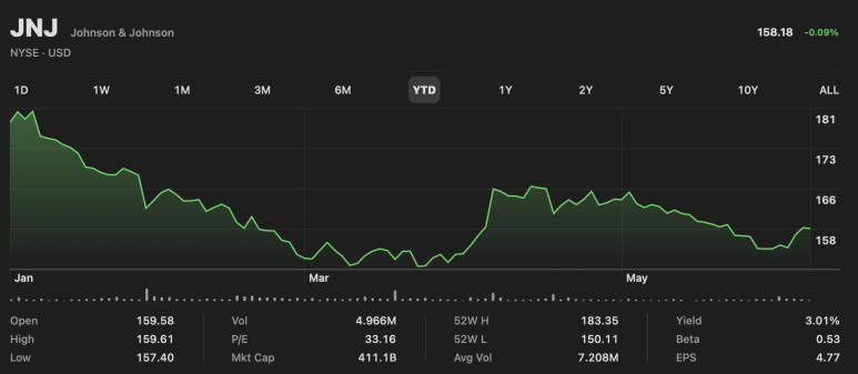 2023년 6월 7일 기준으로 존슨&존슨 주가는 주당 $158.18이며, 수익률은 4.29%로 올해들어 주가가 하락함에 따라 배당금은 3.01% 입니다. (원래 2% 수준이였는데...주가가 하락해서 생겨난 결과라 마냥 좋지만은 않습니다;;)