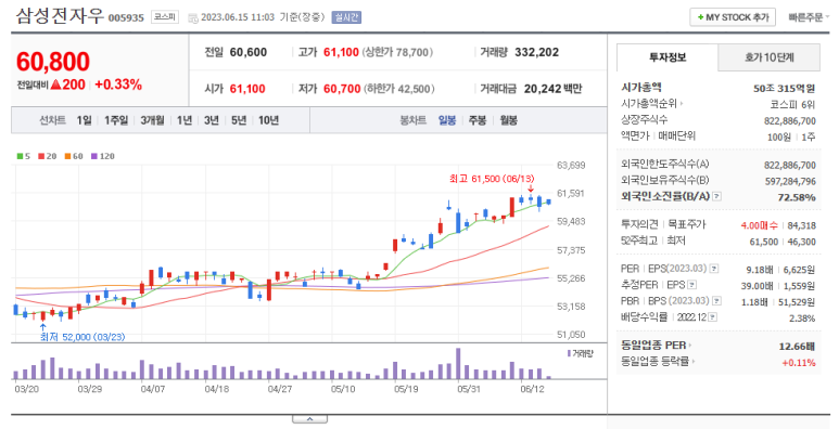 2023년 5월 18일 현재 삼성전자우의 수익률은 23.59%이고, 연간 배당율은 2.36%로 나쁘지 않은 배당을 받을 수 있습니다.