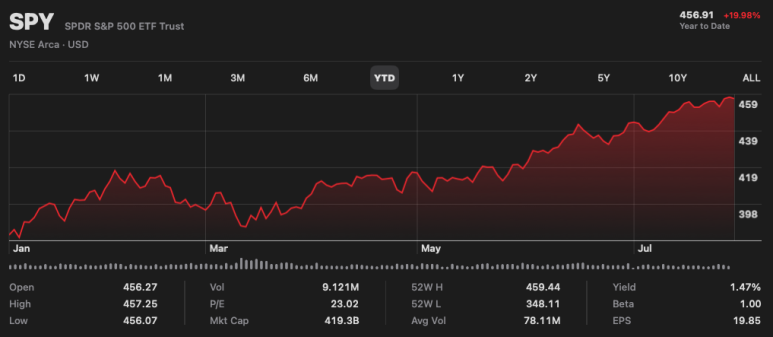 2023년 8월 1일 기준으로 SPDR 주가는 $456.91이고,