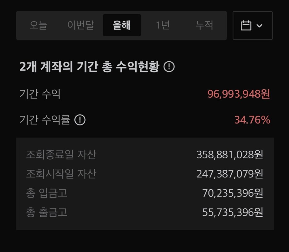 올해 수익 1억원을 돌파했다가 최근 주가하락으로 다시 1억 밑으로 떨어졌습니다~^^;;;