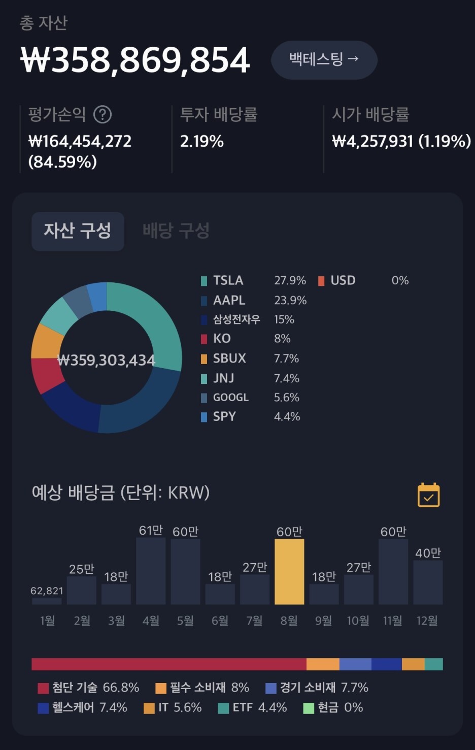 2023년 8월 7일 기준으로 제 주식자산의 평가금액은 358,881,028원이며