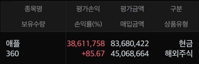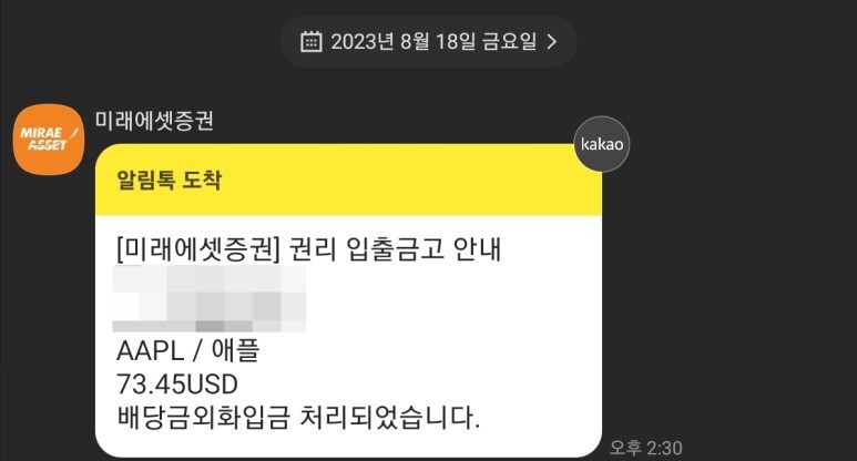 현재 저는 애플 360주를 보유 중임으로 세금을 제외하고 분기 배당금으로 총 $73.45를 수령했습니다!!