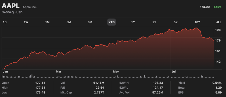 2023년 8월 18일 기준으로 애플 주가는 $174.00이고,