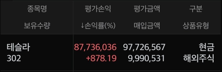 2023년 9월 5일 현재 테슬라의 계좌1 수익률은 878.19%이고 계좌2 수익률은 4.26% 입니다.