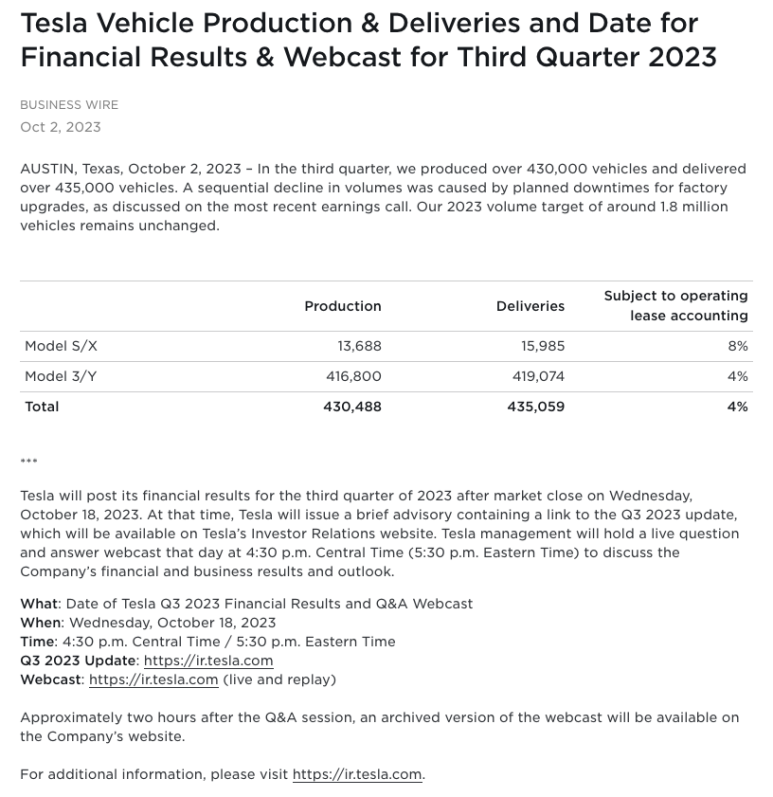 테슬라를 보유하고 있는 주주로서, 2023년 3분기 전기차 생산량/판매량은 정말 매우 중요한 발표이고,
