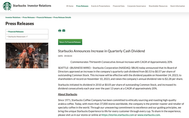 저번달 스타벅스에서 분기 배당금을 기존 $0.53 에서 $0.57로 약 7% 정도 인상을 해서