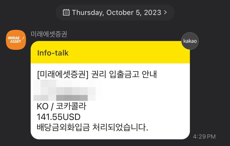제가 보유 중인 종목 중 하나인 코카콜라에서 배당금이 입금된 것을 확인하였고,