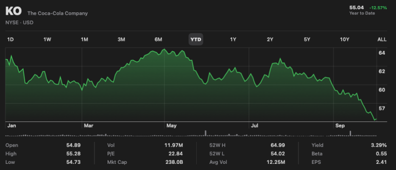 2023년 10월 5일 기준으로 코카콜라 주가는 $55.04이고,