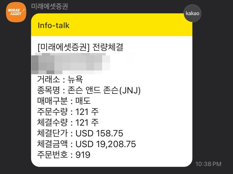 하여, 전 존근앤드존슨을 주당 $158.75에 121주 전량 매도를 하였고