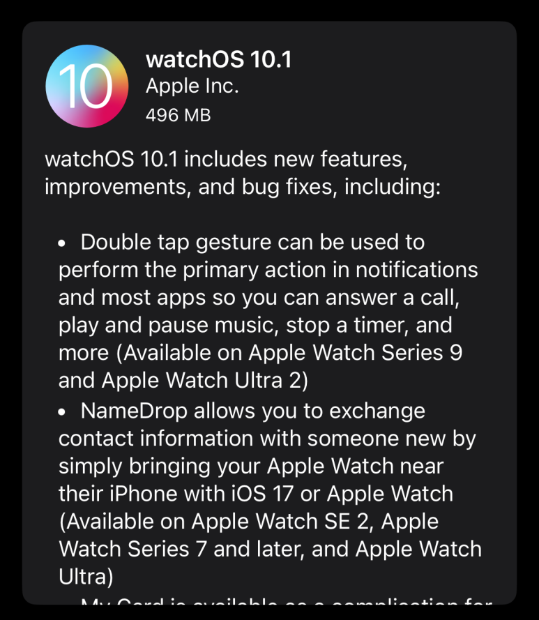 - 더블 탭 제스처를 통해 알림 및 대부분의 앱에 대해 기본 동작을 수행할 수 있게 되어, 전화를 받고, 음악을 재생 및 일시 정지하고, 타이머를 중단하는 등의 작업을 할 수 있음(Apple Watch Series 9 및 Apple Watch Ultra 2에서 사용 가능)