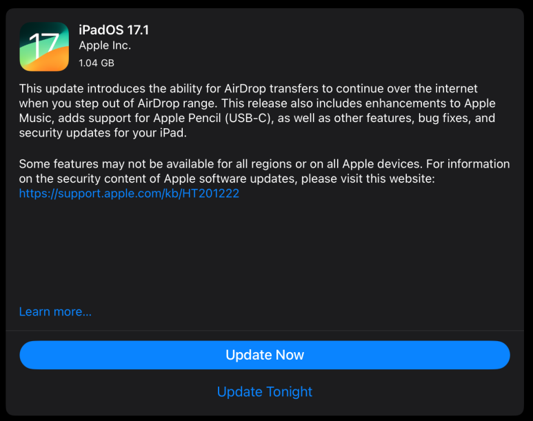 이번 업데이트에는 AirDrop 범위를 벗어났을 때 인터넷을 통해 계속해서 AirDrop을 전송할 수 있는 기능이 도입되었습니다. 이번 릴리즈에는 Apple Music의 기능 향상 및 Apple Pencil(USB-C) 지원이 추가되었으며, iPad의 기타 기능, 버그 수정 및 보안 업데이트도 포함되어 있습니다.