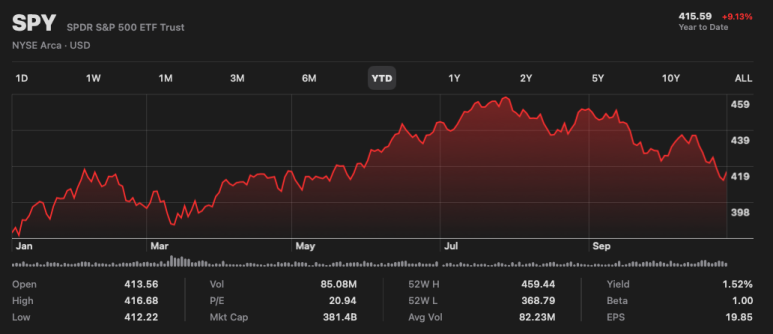 2023년 10월 31일 기준으로 SPDR 주가는 $415.59이고,