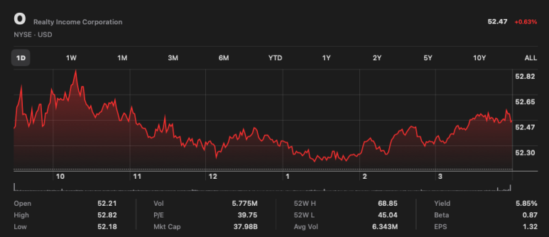 2023년 11월 16일 기준으로 리얼티 인컴 주가는 $52.47이고,