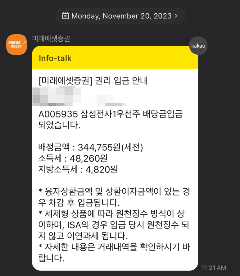 오늘도 열씸히? 일을 하고 있는 중, 2023년 마지막으로 삼성전자우에서 지급한 분기배당금을 수령했습니다~^^