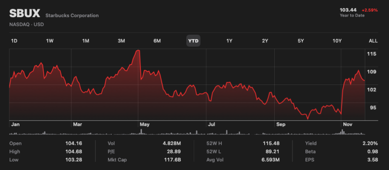 스타벅스는 올해 기준으로 +2.59%로 빅테크에 비해서는 성적이 좋지 않지만