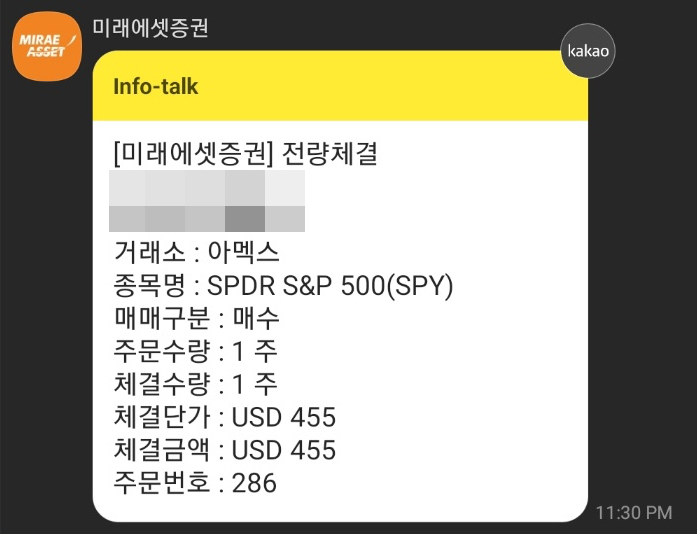 10월 24일 월급을 수령하고 미국장이 열리기 전에 SPDR S&P500 ETF (SPY)를 주당 $455로 1주 매수예약을 했는데 자고있는 동안 체결되었습니다~!