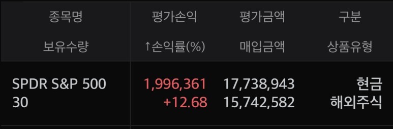 저는 SPY를 30주를 보유하고 있으며, 투자 수익률은 12.68%이고, 연간 배당금은 1.56% 입니다~!