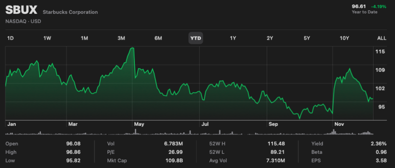 스타벅스는 올해 기준으로 -4.19%로 박스권을 벗어나지 못하는 부진한 모습을 보이고 있지만,