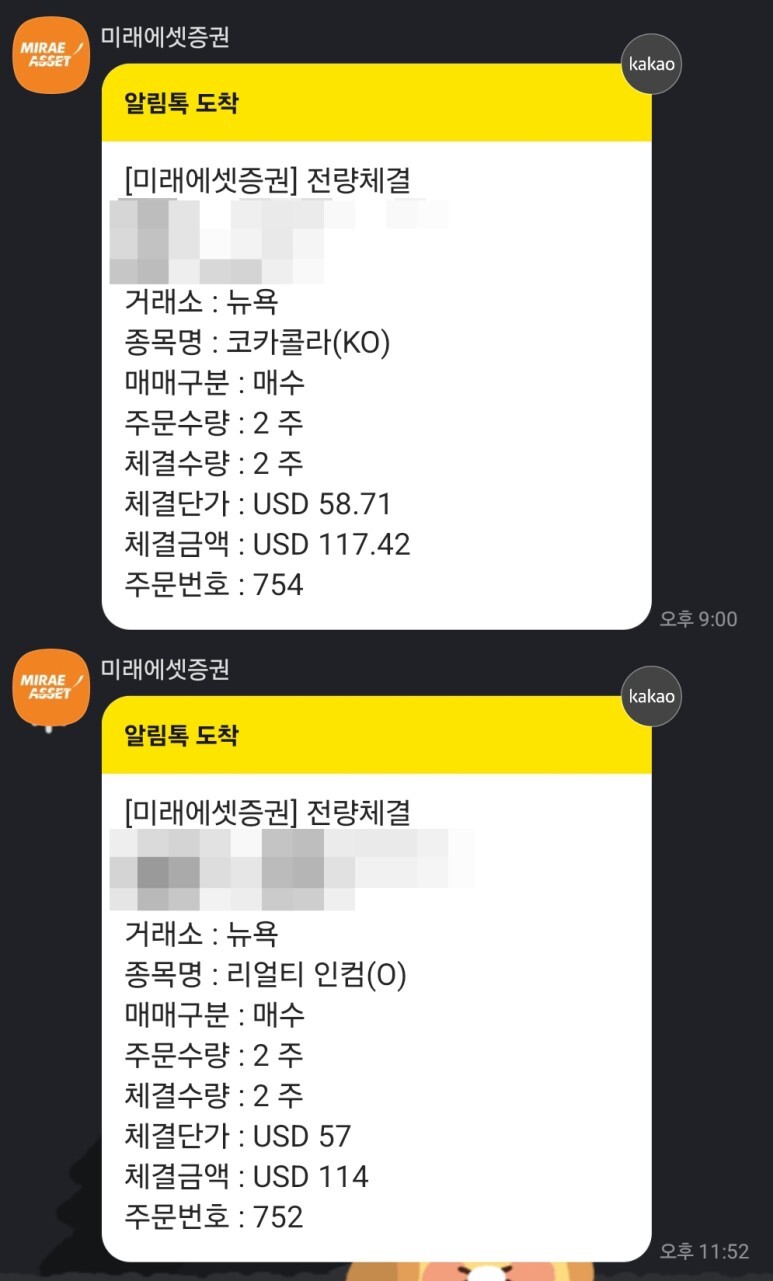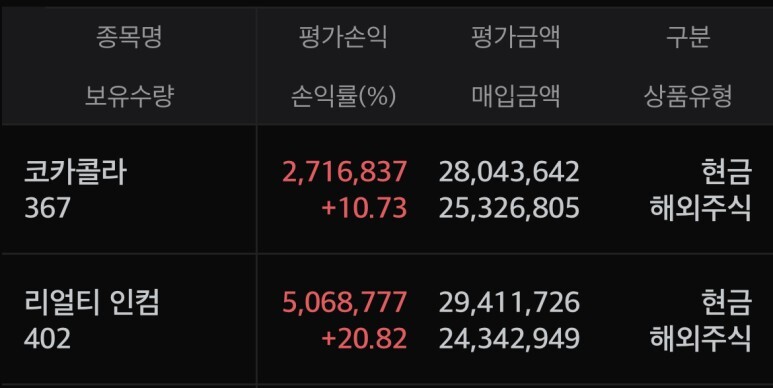 배당금을 그대로 활용하여 코카콜라를 주당 $58.71에 2주 그리고 리얼티 인컴를 주당 $57에 2주를 매수했습니다~