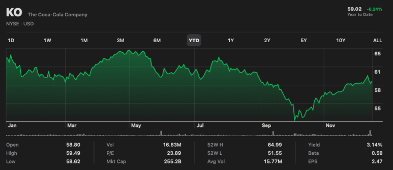 2023년 12월 19일 기준으로 코카콜라 주가는 주당 $59.02이며, 배당금은 3.14%, PER는 23.89이고