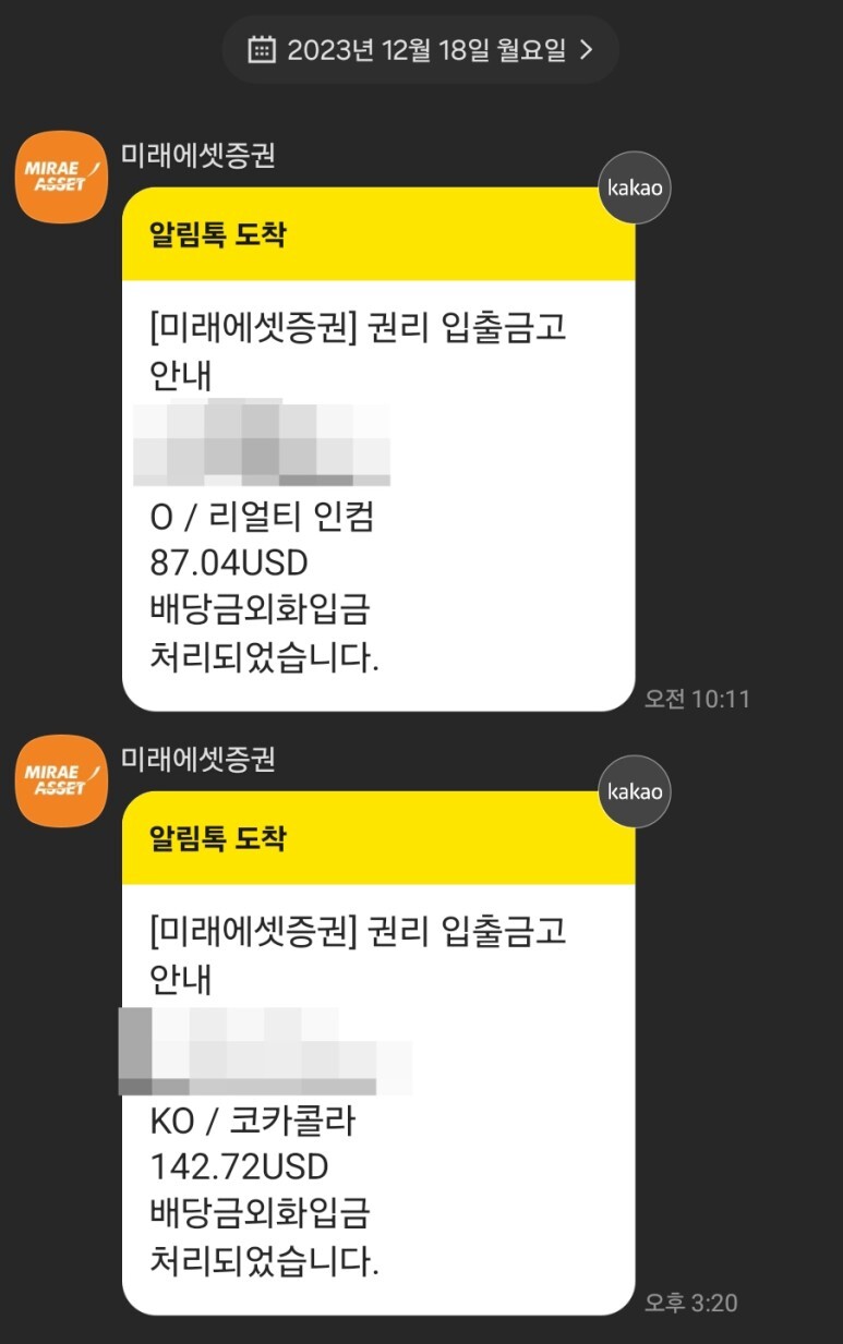 어제 열씸히 일하던 도중 리얼티 인컴과 스타벅스로부터 배당금을 수령했다는 카톡을 받아서 확인해보니~