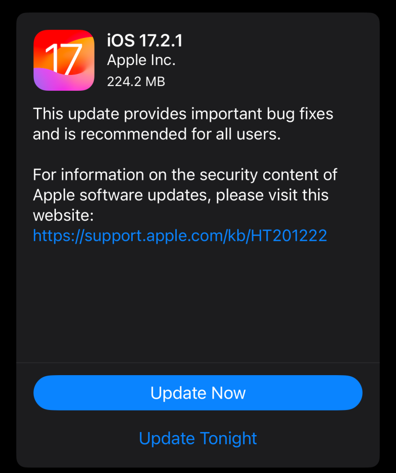 이번 업데이트는 iOS17.2 배포 이후 첫번째 소수점 업데이트이며, 버그수정외에 다른 업데이트 내용은 표기되어 있지 않음으로 업데이트를 하시는 것을 추천드립니다~^^