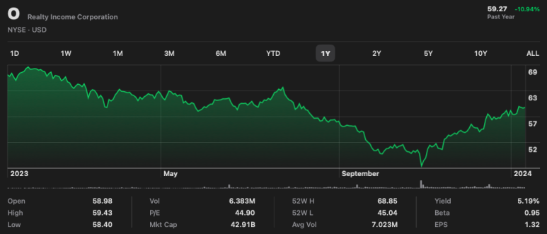 2024년 1월 12일 기준으로 리얼티 인컴 주가는 $59.27이고,