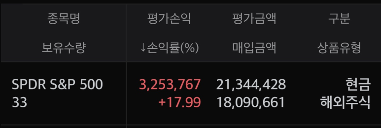 저는 SPY를 33주를 보유하고 있으며, 투자 수익률은 17.99%이고, 현재 주가 기준 연간 배당금은 1.4% 입니다~!