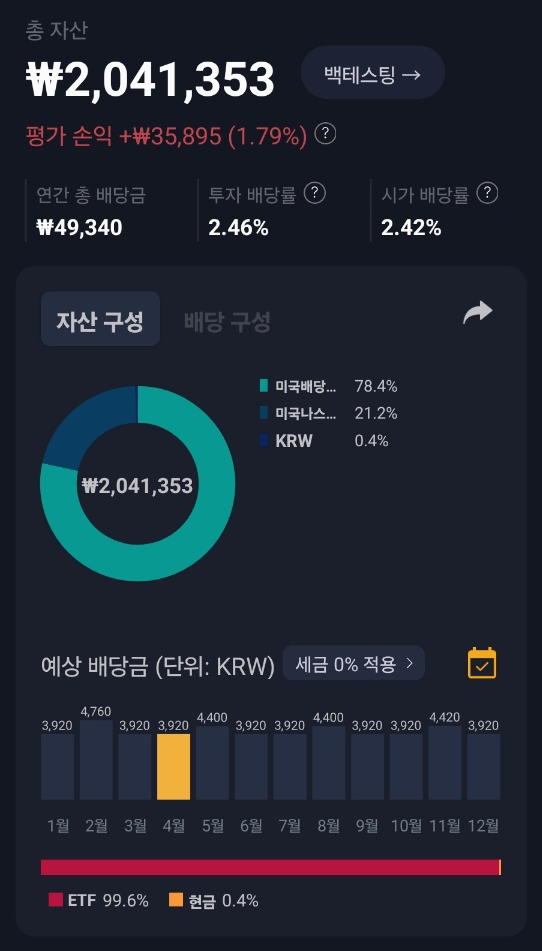 이번 매수로, 2024년 4월 27일 기준으로 저는 TIGER 미국배당다우존스를 140주, TIGER 미국나스닥100을 4주 보유하고 있으며, 연금저축계좌에서 매달 약 3900원의 배당금을 수령할 수 있습니다~!