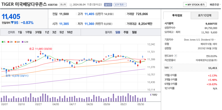 1주당 가격은 11405원, 수익률은 1.38%이며 6월 분배금은 주당 42원입니다~