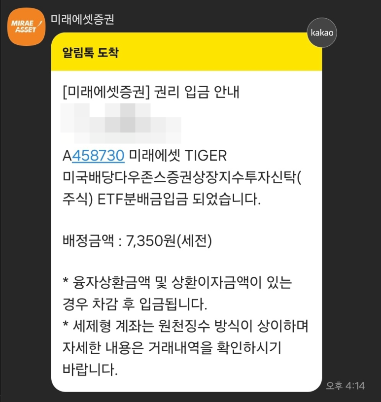 TIGER 미국배당다우존스에서 배당금을 수령했다는 카톡을 받아서 확인해보니~