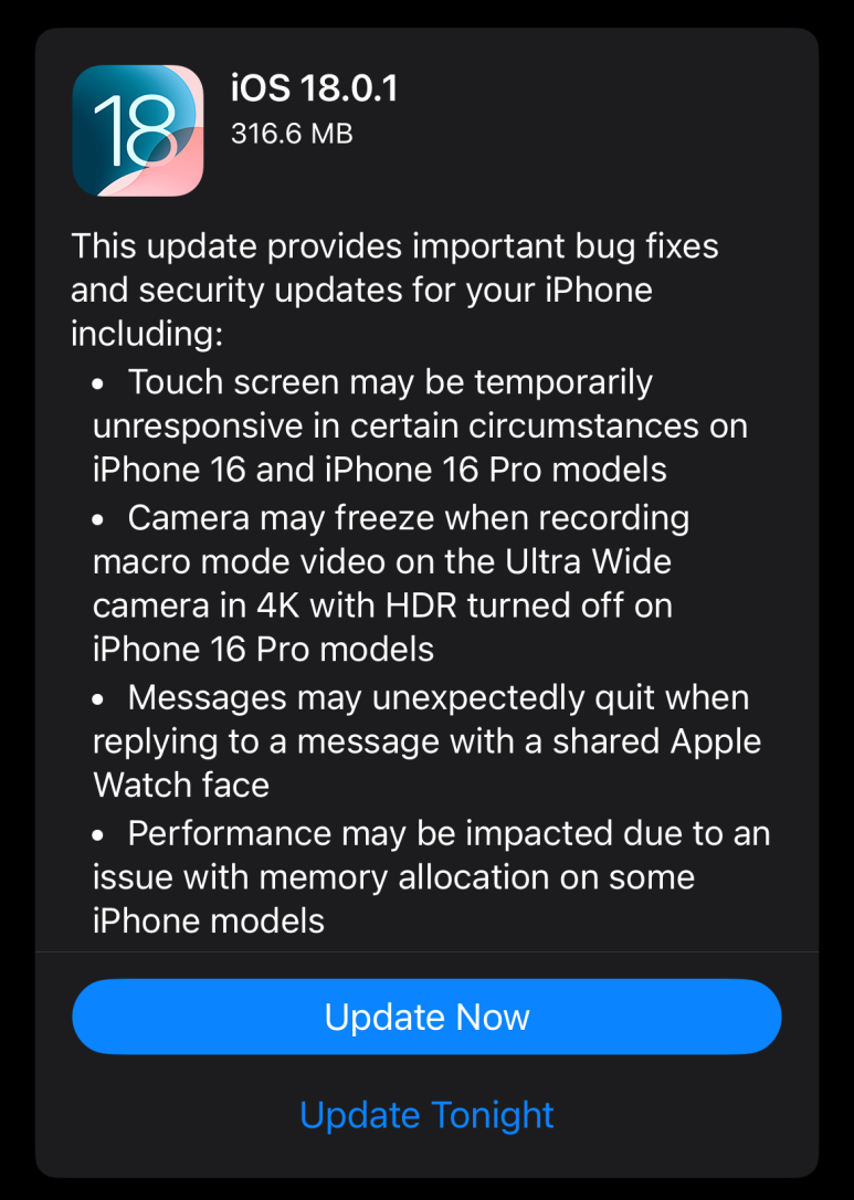 - iPhone 16 및 iPhone 16 Pro 모델에서 특정 상황에 터치 스크린이 일시적으로 응답하지 않을 수 있는 문제