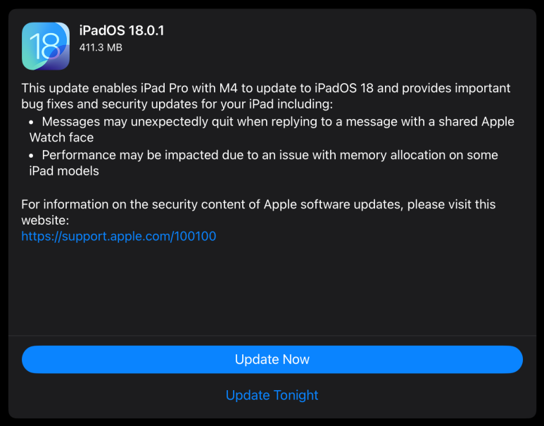 이번 업데이트는 iPad Pro(M4)의 iPadOS 18 업데이트를 지원하며, 다음과 같이 iPad에 관련된 중요한 버그 수정 및 보안 업데이트를 포함합니다.