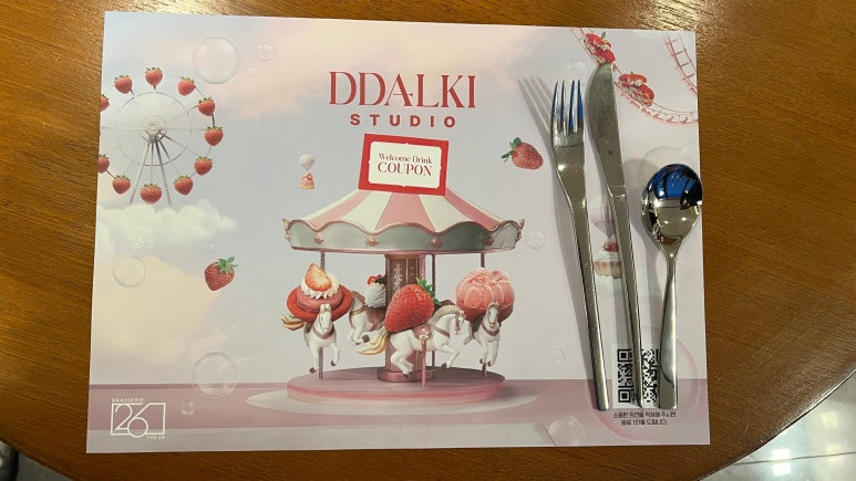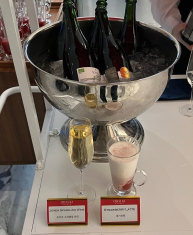 스파클링 와인과 딸기라때 중 하나를 고를 수 있습니다 (전 스파클링 와인을 선택했는데 달달한 과일맛이였습니다)