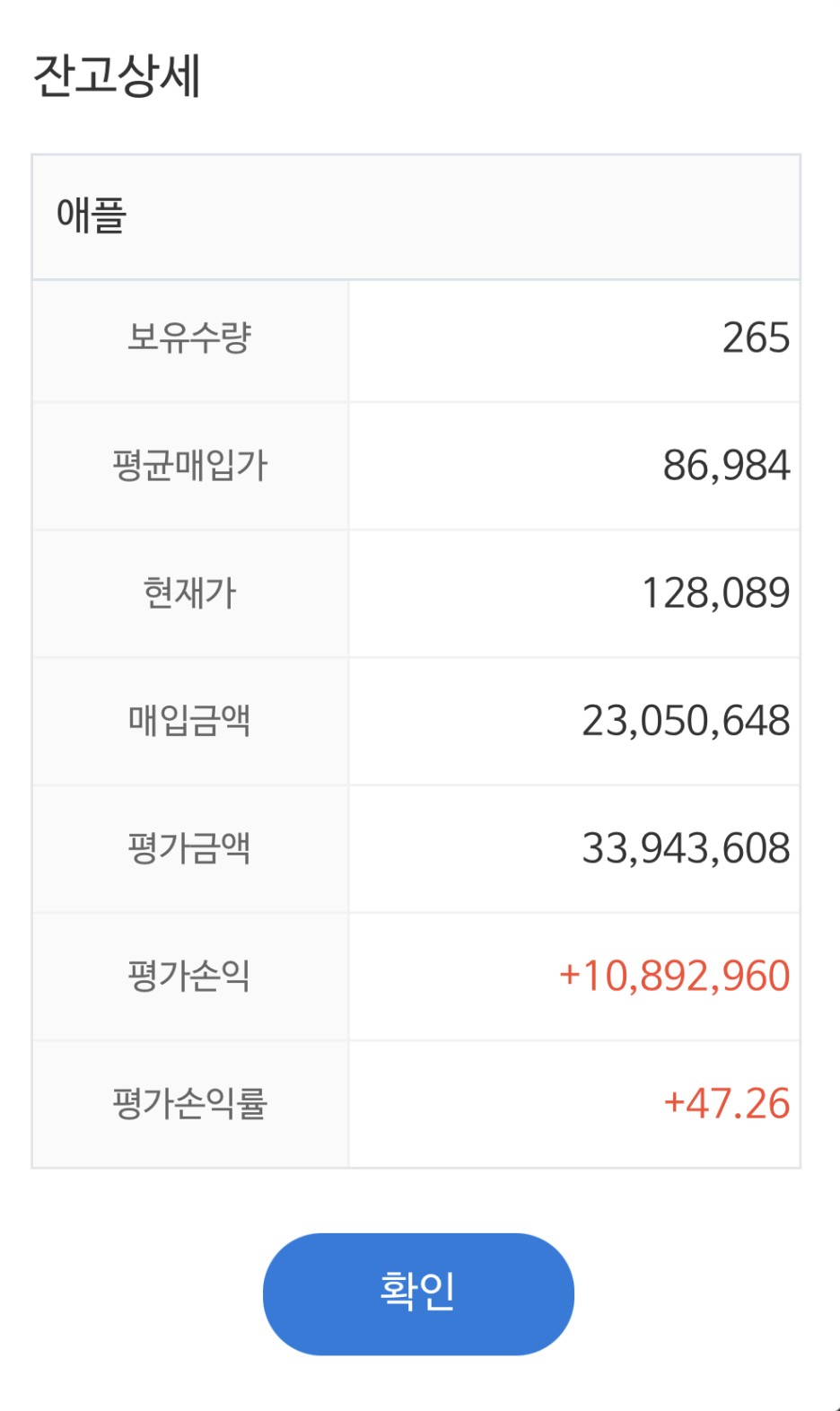 9월 매수로 현재 애플주식을 총 265주를 보유하고 있으며 약 47% 수익을 내고 있는 상황입니다.