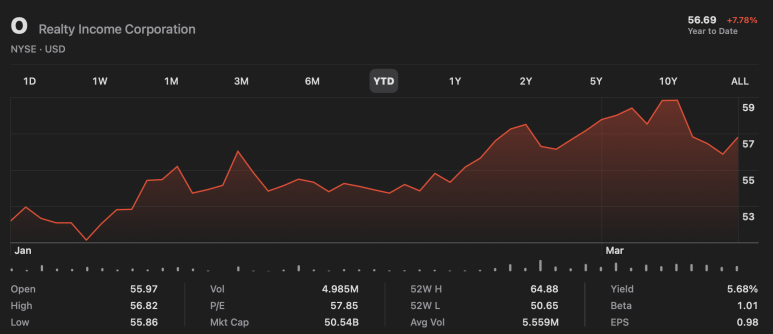 대부분의 종목들에서 하락을 경험하고 있는데 거의 유일하게 올해 이익을 내고 있는 종목이 리얼티인컴이고~