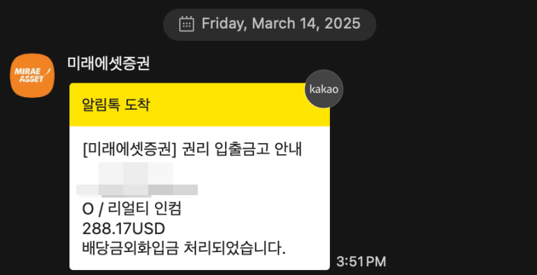 3월 14일에 보유중인 1265주 기준으로 $288.17를 수령하였습니다~~
