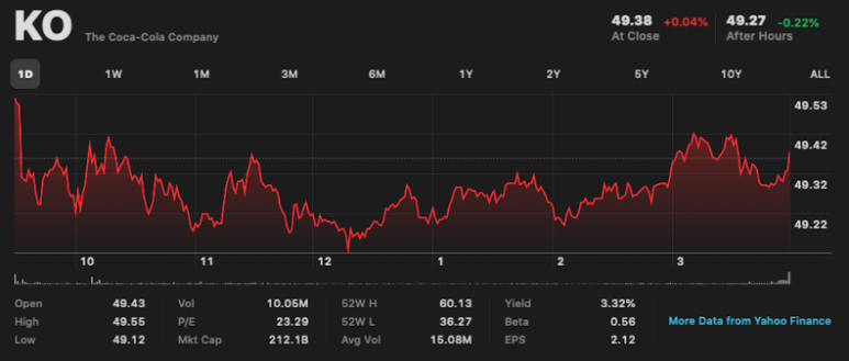 2020년 10월 6일 기준으로 코카콜라 주가는 $49.38이며, 배당률은 3.32%로 은행이자보다 훨씬 짭짤?하기 때문에 주가가 크게 오르지 않더라도 꾸준히 배당금을 늘린 기업입니다.