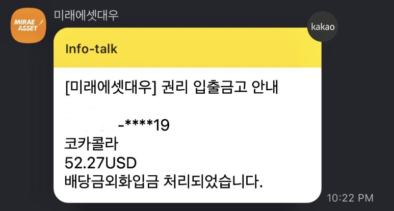 현재 저는 코카콜라 150주를 보유 중이며 이번 배당금으로 $52.27를 받았습니다~!