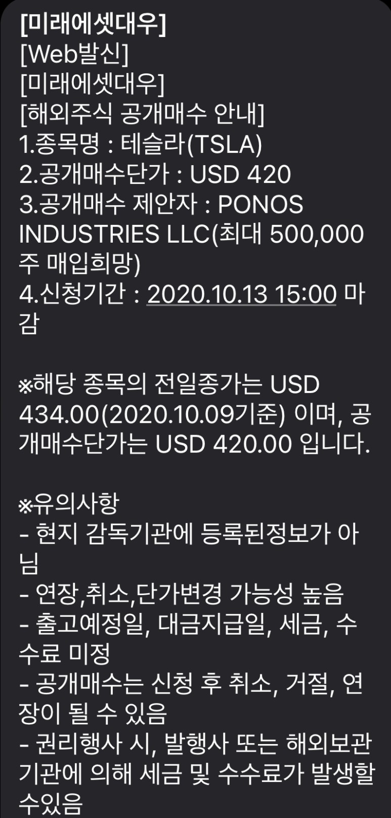 처음에는 뭐지?싶었는데 문자를 자세히 보니 Ponos Industries LLC에서 테슬라 주식을 공개매수하는 내용이였습니다.