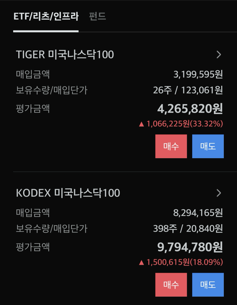 처음에는 TIGER 미국나스닥100과 TIGER미국배당다우존스를 매수하였지만...