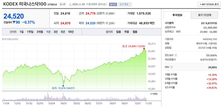 2025년 11월 4일 기준으로 저는 KODEX 미국나스닥100을 398주를 보유중이며