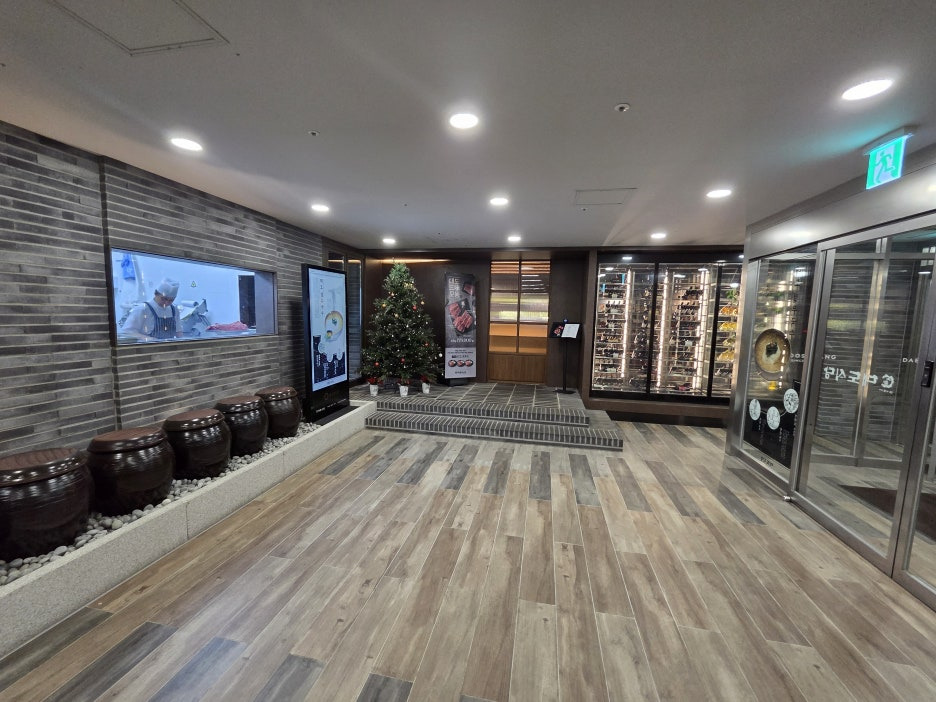 식당입구를 기준으로 왼쪽에는 고기를 손질하는 것을 볼 수 있게 되어 있고 중간에는 식당입구 그리고 그 오른쪽에는 와인들이 많이 있습니다