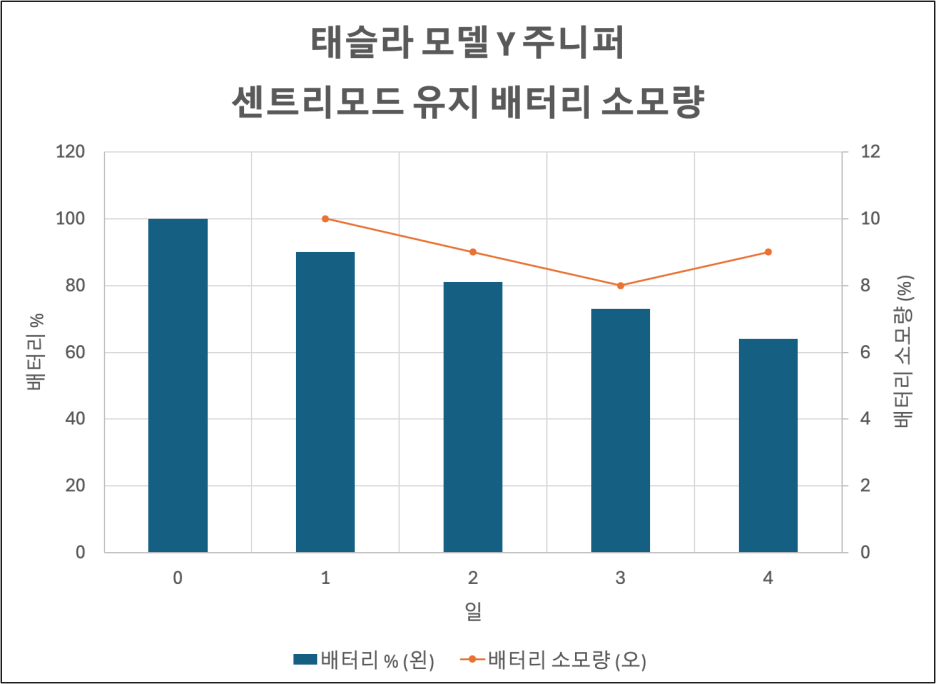 당시에 저는 차량을 운전하면서 센트리모드의 배터리 소모량을 확인하였기에, 이번에는 차량운행을 하지 않으면서 순수하게 주차중인 테슬라 모델 Y 주니퍼의 센트리모드 배터리 소모량을 관찰해보았습니다!