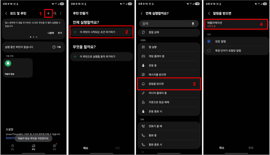 먼저, "모드 및 루틴"에서 오른쪽 위 "+"를 클릭해서 "이 루틴이 시작되는 조건 추가하기"로 들어가서 "알림을 받으면"을 클릭하고 "어플리케이션"으로 들어갑니다.
