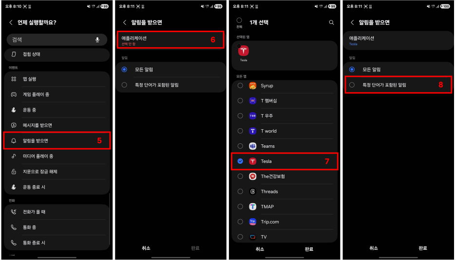 스크롤을 내려서 "알림을 받으면"을 클릭하고 "어플리케이션"으로 들어가서 "Tesla" 어플을 선택하고 "완료"를 눌러서 "특정 단어가 포함된 알림"을 클릭합니다.