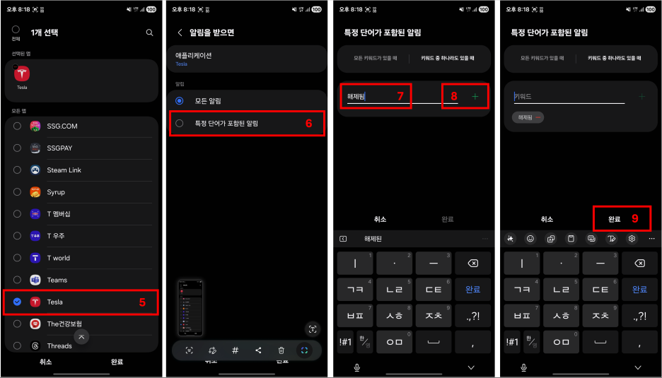 어플리케이션 리스트에서 "Tesla"를 선택한 다음 "특정 단어가 포함된 알림"으로 들어가서 키워드로 "해제됨"을 입력한 후 "+"를 눌른 후 "완료"를 클릭합니다.