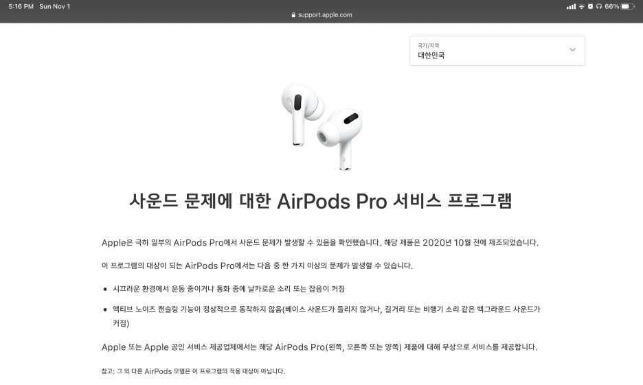 2020년 10월 30일에 애플이 사운드 문제가 있는 에어팟 프로를 대상으로 서비스 프로그램을 발표했습니다.