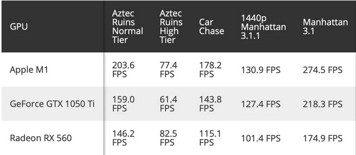 M1 GPU의 경우 “내장그래픽”임에도 불구하고 데스크탑에 탑제되는 GeForce GTX 1050Ti와 radeon RX 560와 비교해서 더 뛰어난 성능을 가진 것으로 파악되었습니다.